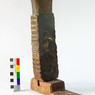 На лопаске нет привычных для прялок Карелии отверстий для крепления спицы, но зато на боковых гранях сделаны зарубки для крепления мотогуза. На ножке выполнены зарубки в форме «ёлочки» с изменяющимся углом наклона после каждой 6 зарубки. Тоже интересный нюанс, придающий резьбе особый ритм.