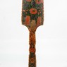 Прялка относится к типу составных прялок, у которых донце соединяется с ножкой и лопаской при помощи шипового соединения. Выделяется она прежде всего своими декоративными особенностями. На лопаске по тёмно-красному фону в технике росписи нанесён традиционный растительный орнамент из стебля с цветами. На стороне, обращённой от прядильщицы, на тёмно-зелёном фоне изображён тот же сюжет. Но, вероятно, большие красные бутоны были пририсованы позднее, так как по технике исполнения они отличаются от росписи на другой стороне лопаски.