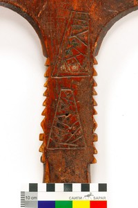 Большую загадку представляют прорезанные трапециевидные фигуры на лопаске и на ножке. Три фигуры в нижней части лопаски и одна на верхней части ножки с одной стороны. С другой — две аналогичные фигуры на ножке. Пока у нас нет версий, что это может быть. Какой-то орнамент со своим смыслом? Возможно…