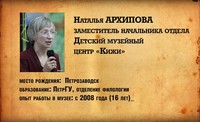 К 30-летию Детского музейного центра «Кижи» представляем его сотрудников. Начинаем знакомство с Натальи Анатольевны Архиповой, на сегодняшний день самого опытного музейного педагога центра, Почетного работника образования России. Всегда с улыбкой на лице, даже в непогоду и в трудный рабочий день. Коллеги считают Наталью Анатольевну позитивным, светлым человеком. Она объясняет, что черпает энергию в семье, друзьях любимой работе и острове Кижи.