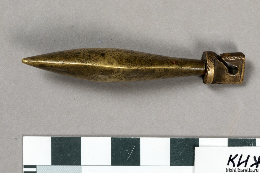 Выполнена в форме рыбки, полая внутри. На корпусе канфарением нанесены узоры в виде дуг из V-образных засечек.