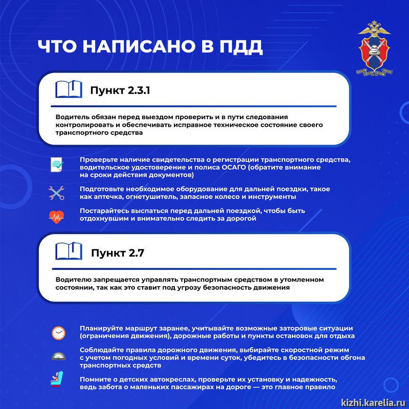 Предлагаем вниманию всех, кто собирается приехать на остров Кижи автомобилем по дороге до деревне Оятевщина, ближайшей к острову точки Заонежского полуострова, материалы ГИБДД о том, как подготовиться к безопасному автопутешествию.