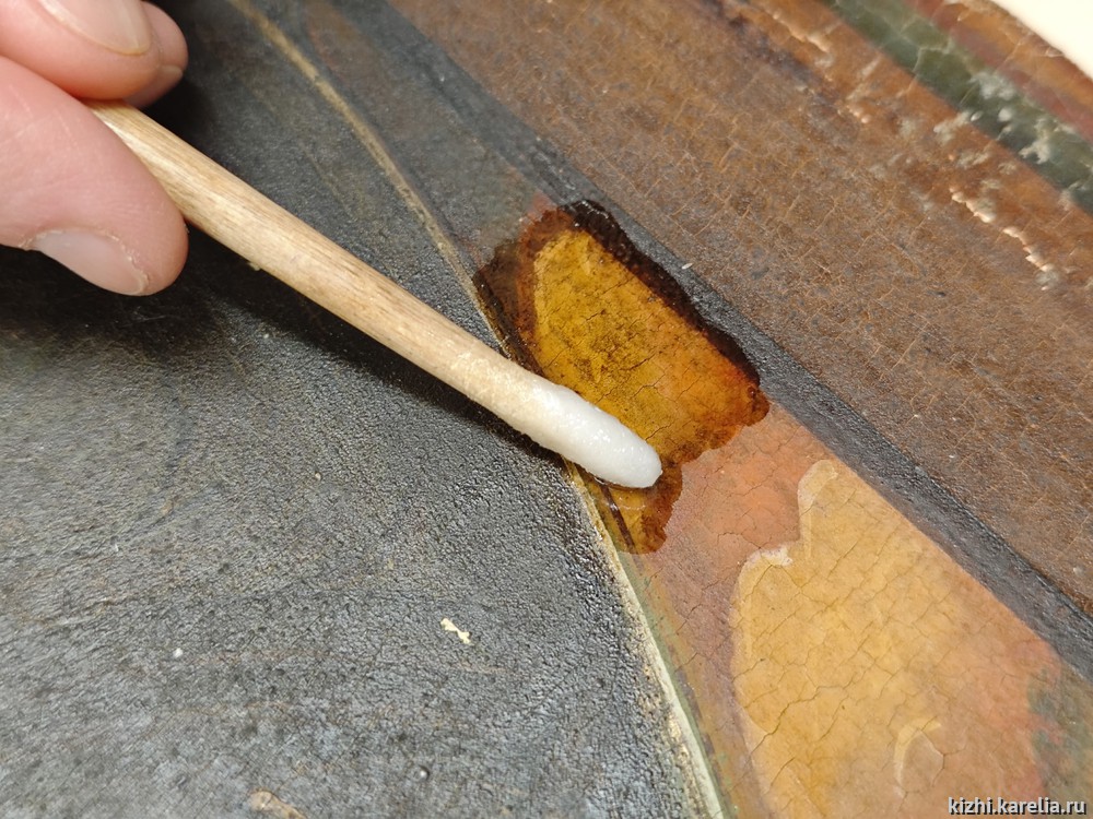 Реставратор темперной живописи Надежда Куусела начала раскрытие авторской живописи, а реставратор предметов из дерева Михаил Фролов — укрепление деревянной основы.