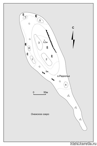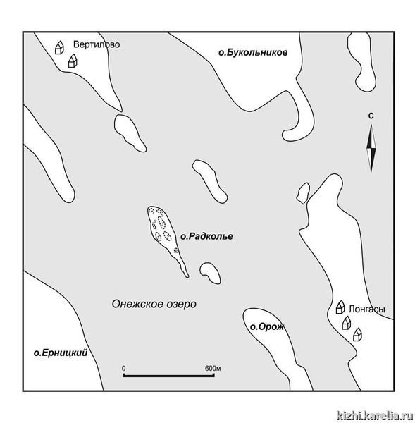 Остров Радколье Онежского озера входит в состав архипелага Кижские шхеры и находится вблизи южной оконечности Заонежского полуострова, у западного берега Большого Клименецкого острова, примерно в 1,3 км к северо-западу от деревни Лонгасы (рис. 1). Он занимает выгодное географическое положение: от ветра с Онежского озера с востока и юга его закрывает Большой Клименецкий остров, с запада — остров Ерницкий и Большой Леликовский остров, с севера — Заонежский полуостров.