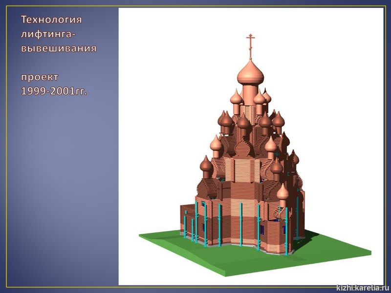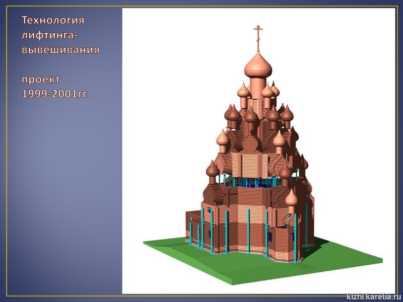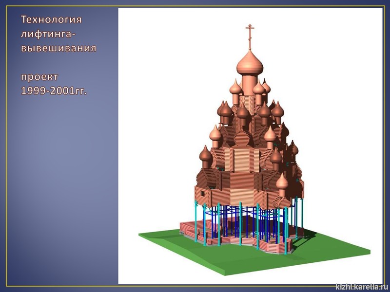 Для выполнения данной задачи специально была разработана уникальная инженерная система лифтинга–вывешивания. С помощью домкратов, металлических стоек и конструкций, три отдельных верхних объема церкви поднимаются на расчетную высоту, где жестко фиксируются. Еще три нижних объема вывешиваются и опять же жестко фиксируются. А самый нижний объем церкви разбирается и увозится с погоста в производственный комплекс на реставрацию.