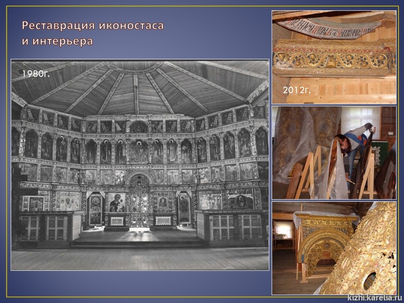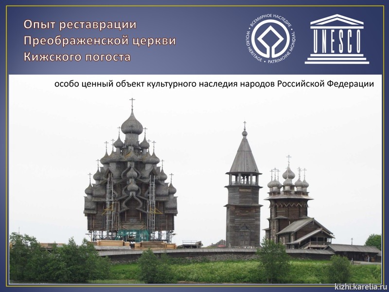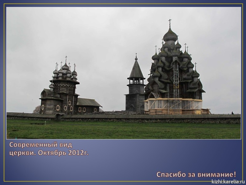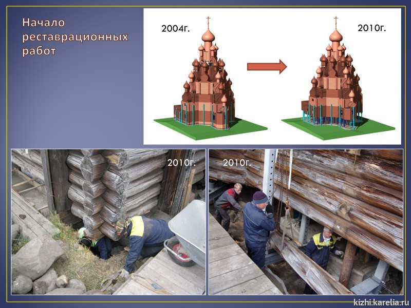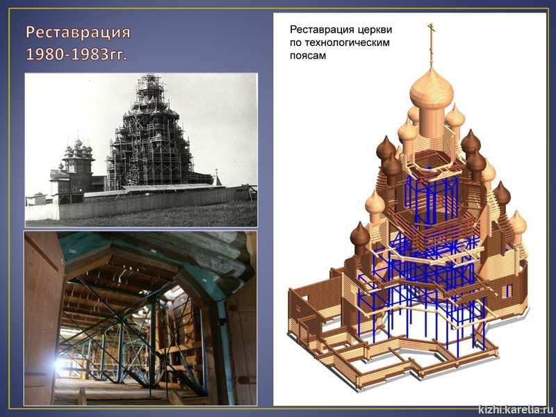 К сожалению, за отведенное время доклада невозможно рассказать о многих интересных моментах проводимой сейчас реставрации, таких как реставрация исторических бревен, исправление деформаций, инженерное укрепление конструкций, технические системы охраны и пожаротушения и т.д.