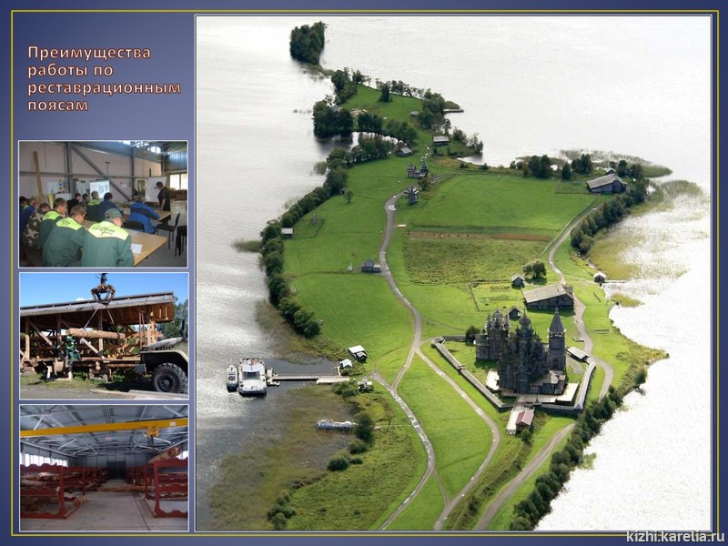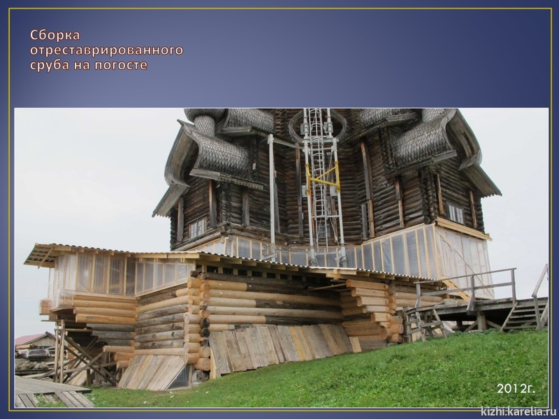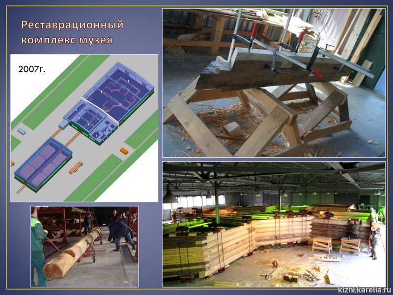Для ремонта оригинальных исторических бревен церкви на острове Кижи был специально построен Реставрационный комплекс – уникальный мини–завод, в котором бревна хранятся на специально оборудованных стеллажах, проходят тщательное обследование и лечение, предварительно собираются в сборочном цеху в сруб. Предварительная сборка в сруб вылеченных и отремонтированных бревен позволяет значительно повысить качество реставрационных работ, заранее устранить и исправить возможные недостатки, что в принципе невозможно при традиционной работе на открытом воздухе. Для контрольной проверки качества работ на отремонтированный сруб имитируется нагрузка, близкая к реальной. Равномерно распределенные по стенам домкраты выдают расчетное давление в пределах 12 тонн на погонный метр (12 т/пог. м.).