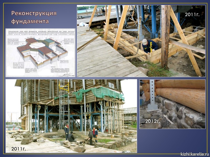 Совместная работа Плотницкого центра, подрядных организаций из Карелии и Санкт–Петербурга на реставрации Преображенской церкви позволила в 2012 году установить на реконструированный фундамент уже отреставрированный подклет памятника. Сейчас работы продолжаются, реставрация идет в круглогодичном режиме и через 5 лет планируется ее завершение.