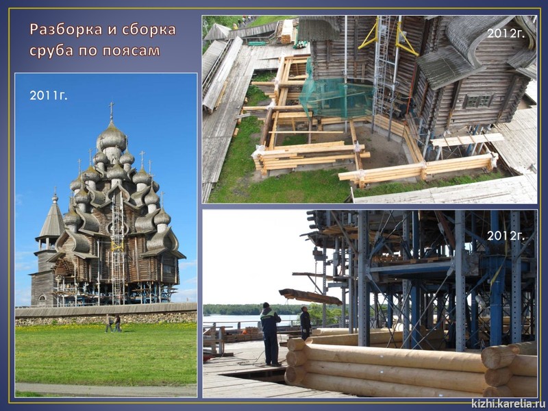 С помощью технологии лифтинга–вывешивания сруб церкви разбирается снизу–вверх путем поочередного снятия бревен. Традиционно деревянные срубы разбираются сверху вниз, т.е. от креста до фундамента, в нашем случае, наоборот. Практика доказала, что нет принципиальной разницы между двумя способами разборки и обратной сборки деревянных конструкций. Обе последовательности разборки–сборки рубленых бревенчатых стен вполне удобны и могут использоваться. Полностью отработав инженерную систему лифтинга и технологию нетрадиционной разборки, а также технологию реставрации отдельных деревянных элементов и их сборки в цехах и на погосте, можно сказать, что реставрация Преображенской церкви является своего рода кузницей новых идей и подходов, которые можно и нужно внедрять в реставрационную практику.