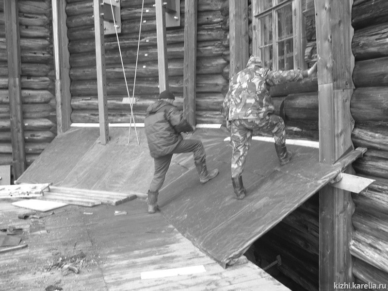 Вместе с коллективом «Алекона», до 18 октября на Преображенской церкви работали сотрудники Плотницкого центра музея – А. Калинов, В. Назарьев, В. Кялин, Ю. Юрьев, А. Кузнецов, которые под руководством А. Куусела выполняли плотницкие и верхолазные работы.