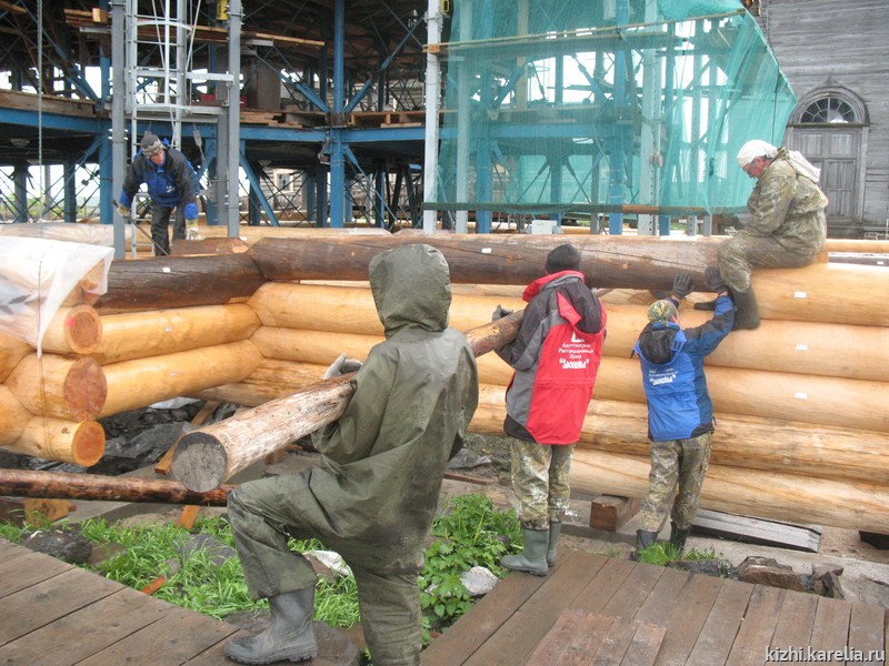 О проводимых в летний сезон работах рассказал руководитель реставрационных работ на Кижском погосте Николай Попов: «Наконец-то мы достигли главного – на погосте началась сборка отреставрированного сруба церкви. Причем, эта работа осуществляется с самого сложного пояса церкви. Сложного как конструктивно, так и по объему, который включает саму церковь и пристроенную трапезную с главным двухвсходным парадным крыльцом и южным дополнительным всходом. Сложного также тем, что он наиболее деструктивен и тем, что он первый и совмещен с надземной каменной частью фундамента, возведение которой также запланировано в этом сезоне.