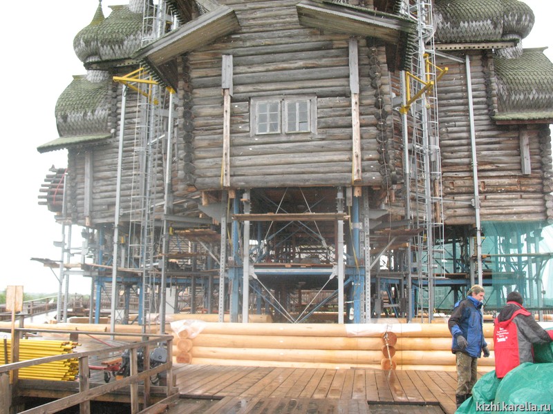 Перед началом нынешнего летнего реставрационного сезона в соответствии с существующим законодательством были проведены конкурсы на проведение очередного этапа работ по реставрации Преображенской церкви, по итогам которых работу с металлоконструкциями системы лифтинга продолжает санкт-петербургская фирма «Алекон», а сборкой на погосте отреставрированных частей сруба занимаются реставраторы ООО АРЦ «Заонежье». Вся работа проходит под руководством специалистов музея «Кижи».