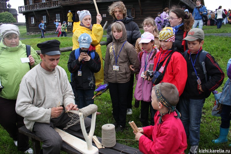 Когда набирается полотно, оно наматывается на сетевязку. Теперь его надо закрепить, то есть проварить. Варили полотно в обычной кастрюле в специальном растворе. Раствор был разным: он не только пропитывал и закреплял сеть, но и окрашивал. Окраска необходима для каждого водоема своя: в Карелии вода не кристально чистая, сети нужны разных цветов. У каждого мастера был свой секрет раствора: использовали корни деревьев, кору, разные красящие овощи. После того, как сеть проварили, сеть насаживали: закрепляли верхний и нижний шнуры. Молодой мастер как раз занимается витьем такого изделия: делает две вьюшки, два витых шнура, очень похожих на нитки. В отличие от обычной прямой нити, шнур очень крепкий. На верхний шнур обычно использовали так называемые поплавки — их изготавливали из бересты, которую резали на полоски. При обработке кипятком они сворачивались, и получались трубочки, в которые потом продевался шнур, и получались поплавки. В роли современного грузила использовали или металлические кольца (их брали чуть больше размером, чем ячея сети, чтобы они не путались), или делали специальные мешочки из бересты, в которые вкладывали камушки. Когда сеть была готова к использованию, можно было ее устанавливать. - — Как долго сеть используется?