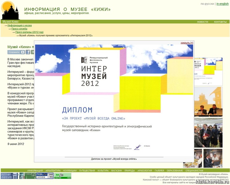 Профессиональное музейное сообщество в 2012 году неоднократно обращало своё внимание на музейный сайт. На Международном фестивале «Интермузей — 2012» в номинации «Музей — главный информационный ресурс культурного туризма» музей «Кижи» участвовал с проектом «Музей всегда online» (авторы — О. Ю. Титова и А. А. Кириличева), рассказывающим о деятельности музея в интернет-пространстве. По итогам работы Интермузея этот проект был отмечен дипломом фестиваля и премией оргкомитета. На XVI Ежегодной международной научно-практической конференции АДИТ — 2012 сотрудниками Отдела информационных и компьютерных технологий было прочитано 3 (sic!) доклада, посвящённых особенностям функционирования музейных интернет-проектов. По специальному приглашению был сделан отдельный доклад о сайте на международном семинаре руководителей особо охраняемых природных территорий в Кенозерье.