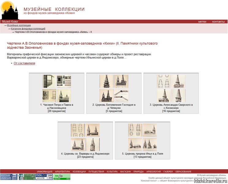 Отдел фондов музея в рамках популяризации архитектурного наследия представил новый интернет-каталог из 77 чертежей А. В. Ополовникова, размещённый в разделе «Музейные коллекции» (автор интернет-каталога — Л. С. Харебова, хранитель коллекции). В каталоге представлены материалы графической фиксации заонежских церквей и часовен середины ХХ века: обмеры и проект реставрации Варваринской церкви в д. Яндомозеро, обмерные чертежи Ильинской церкви в д. Поля. В коллекции чертежей Богоявленской церкви в Челмужах представлены 5 авторских работ А. В. Ополовникова: три чертежа реставрации и два обмерных чертежа её деталей. Этот каталог продолжает своеобразную серию «архитектурных» каталогов, начатую год назад публикацией чертежей памятников Кижского погоста.