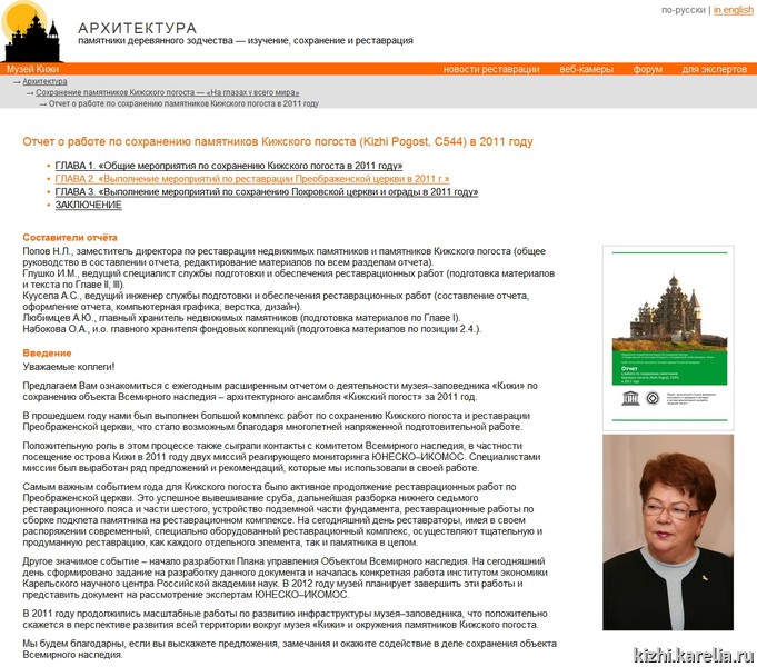 Особое внимание в работе над сайтом уделяется освещению сохранения и реставрации памятников деревянного зодчества. В текущем году был опубликован «Отчет о работе по сохранению памятников Кижского погоста в 2011 году»; значительно пополнилась фотогалерея, демонстрирующая текущий этап реставрации; в каталоге архитектурных памятников перечислены наиболее значимые работы на всех памятниках острова Кижи и Кижского ожерелья. В специальном разделе «Для экспертов реставрации» стали доступны ещё 2 веб-камеры, установленные в реставрационном комплексе, где происходит реставрация поясов Преображенской церкви (отснятый в прошлом году первой веб-камерой материал был востребован — так, он был использован при создании видеороликов о реставрации, демонстрировавшихся на международной конференции АДИТ — 2012 и отчётной конференции музея).