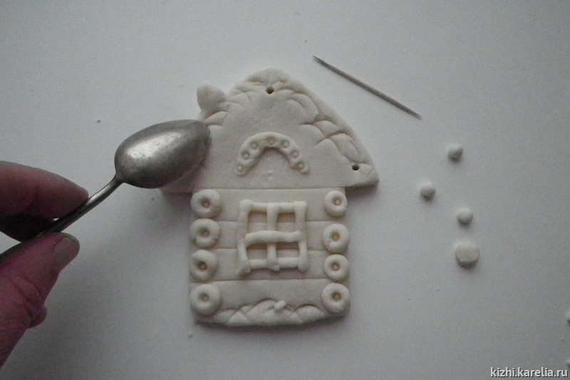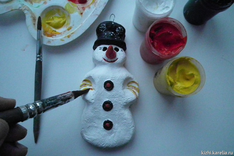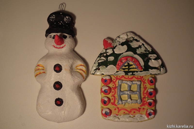 - Когда тесто подсохнет, расписываем яркими красками. Когда подсохнет краска, наносим последние штрихи — несколько мазков белилами, чтобы снег лег на крышу избушки.