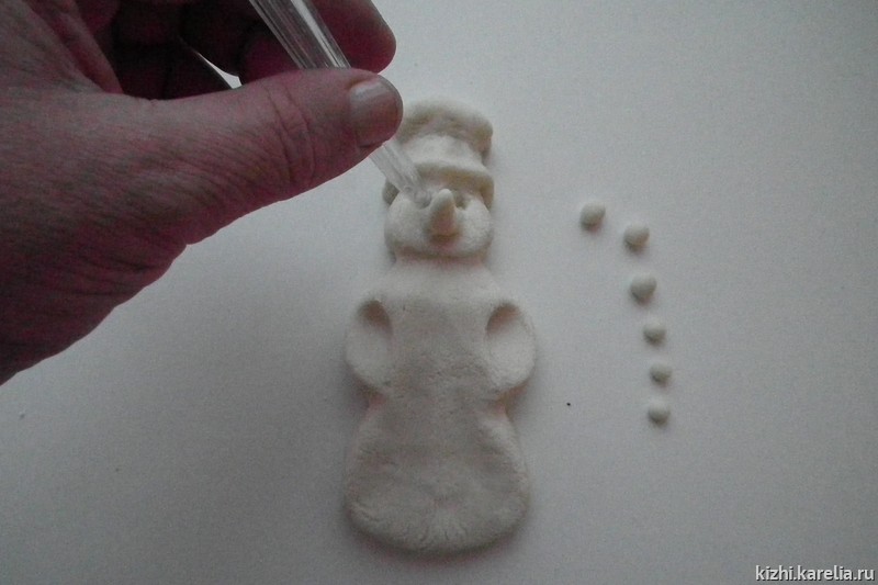 - Три шарика приложим на смоченное водой туловище и прижмем пальцем. Это будут пуговки, нажмем кончиком авторучки. В шляпу воткнем скрепку.