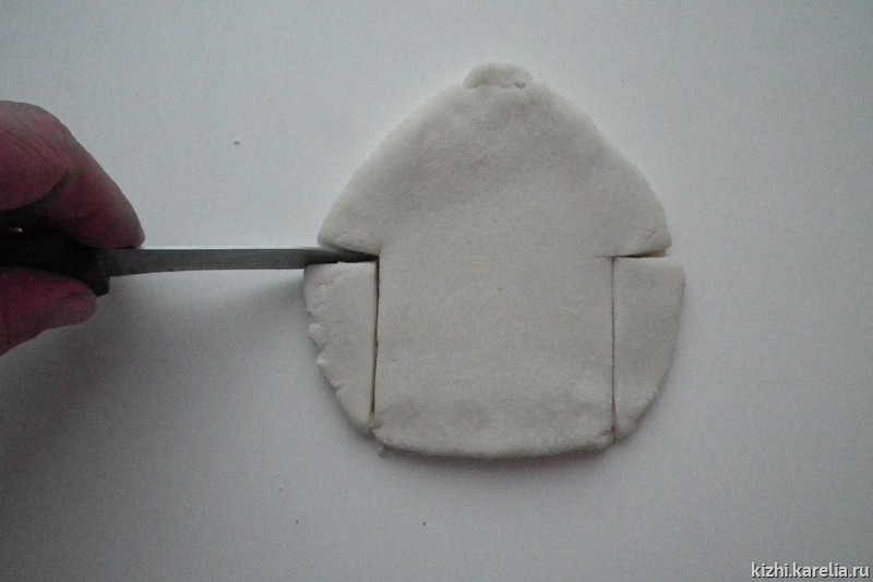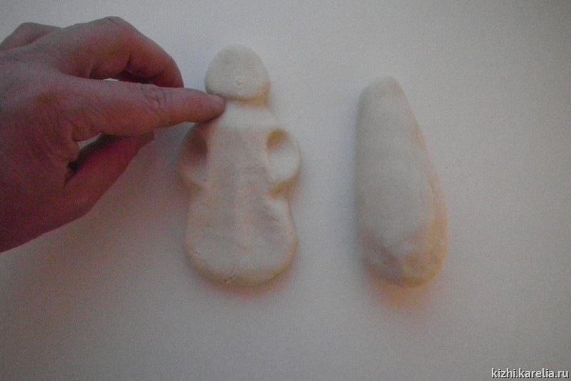 - Из теста скатываем «толстенькую морковку», потом сплющим ее ладонью. Зажмем немного в середине и сделаем руки, также сформируем шею и голову.