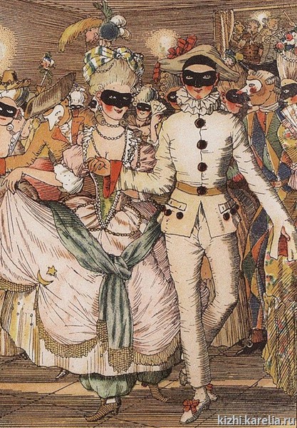 Маскарад предстает перед гостями выставки в фантастических и загадочных образах русских художников рубежа XIX и XX веков — К. Сомова, С. Судейкина, Н. Сапунова, которые можно увидеть в репродукциях их работ.