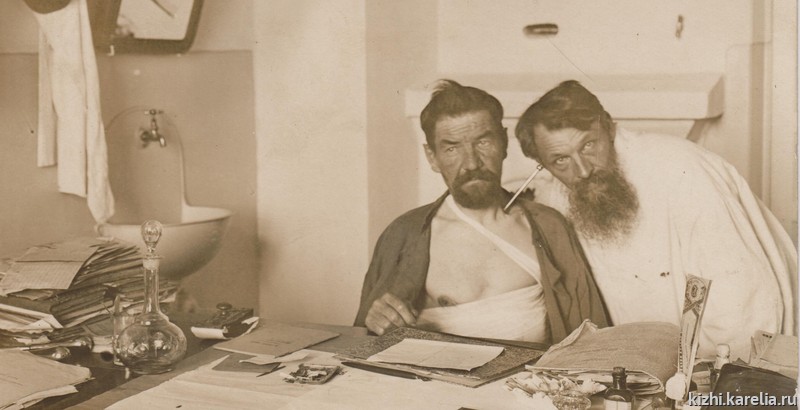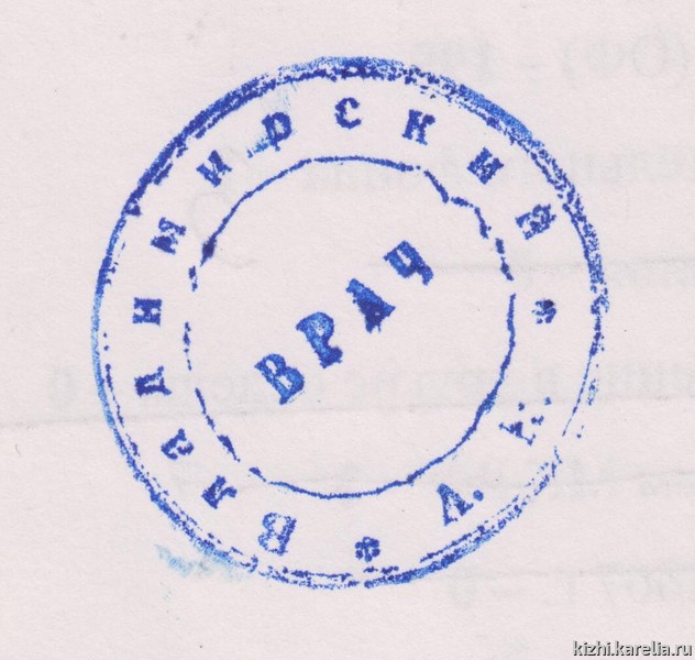 95 лет назад в Карелию приехали земский врач Алексей Иванович Владимирский (1882—1942 гг.) и его жена Софья Филипповна Полещук-Тимошук (1880—1944 гг.), фельдшер. Оба работали по специальности до начала Великой Отечественной войны. В 1930-е годы Алексей Иванович был главным врачом Повенецкой больницы. В этой же больнице трудилась и Софья Филипповна. Внучка медиков С.А. Баева передала музею 18 предметов, принадлежавших этой семье. Среди них свидетельство на имя Алексея Ивановича Владимирского об утверждении его в степени лекаря с отличием «по выдержании испытания, определением Медицинского Факультета Императорского Юрьевского Университета», датированное 4 февраля (ст. ст.) 1913 г. На этом документе стоят подписи ректора университета, русского математика Виссариона Григорьевича Алексеева, незаслуженно забытого, по мнению специалистов, и декана факультета Вячеслава Алексеевича Афанасьева, врача и государственного деятеля. Два документа удостоверяют специальное образование Софьи Филипповны: свидетельство об окончании ею «полного курса учения» в Калужской земской фельдшерской школе и присвоении ей звания фельдшерицы (1910 г.) и свидетельство о присвоении «звания повивальной бабки I разряда» (1911 г.). Интересен внешне ничем не примечательный лист, вырванный из книги «Российский медицинский список» 1914 г., в котором значится Владимирский А. И. с информацией: «82», «Л», «913», «Зем. вр.». Удалось убедиться, что сокращения после фамилии обозначают соответственно год рождения (1882 г.), специальность (лекарь), год окончания курса медицинских наук (1913 г.), должность (земский врач). Выяснилось, что «Российский медицинский список» издавался МВД Российской империи ежегодно в 1809-191[6?] гг. Он содержал информацию обо всех врачах империи, в т. ч. ветеринарных врачах, фармацевтах, повивальных бабках. В 1914 г. «Список» содержал более 42 700 фамилий. Ежегодник имелся во всех аптеках страны с целью обеспечения контроля со стороны фармацевтов за отпуском лекарств — они должны были назначаться компетентными профессионалами. Информативны и выразительны фотографии: «Штат Повенецкой больницы»; А.И. Владимирский, С. Ф. Полещук-Тимошук и их коллеги по Повенецкой больнице за осмотром пациента; А. И. Владимирский прослушивает пациента; А.И. Владимирский среди делегатов Медвежьегорского районного съезда Советов (1934 г.); он же среди участников первой научной конференции врачей Медвежьегорского района (1935 г.). В коллекции — именная печать врача А. И. Владимирского, его карманные часы фирмы «Ф. Винтеръ».
