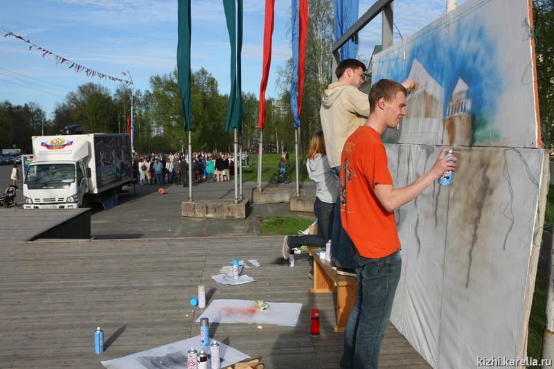 А еще все, кто побывал на «Ночи музеев» в гостях у музея «Кижи», стали свидетелями студенческого пленэра. Студенты Славянского института на холстах в стиле граффити выполняли коллективную работу на тему: «История Петрозаводска. Архитектура Соборной площади». На глазах посетителей рождалось художественное размышление на тему взаимосвязи исторических эпох, олицетворяемых разными архитектурными символами – Музыкальным театром и Святодуховским собором.