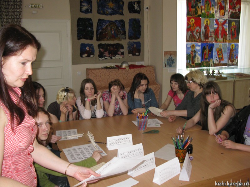 В музее-заповеднике «Кижи» с 20 по 24 мая прошли музейные Дни славянской письменности и культуры, где студенты исторического факультета ПетрГУ, учащиеся колледжа технологии и предпринимательства и школьники из Державинского лицея познакомились с мультимедиапрезентацией «Кирилл и Мефодий — славянские просветители», из которой узнали о мытарствах Кирилла и Мефодия, о появлении кириллицы, о сакральном смысле нашей азбуки, о первых переписчиках, старинных книгах, о материале, на котором писали, и инструментах для письма, а также об эволюции шрифтов от греческого устава до современных Times New Roman, Arial и других.