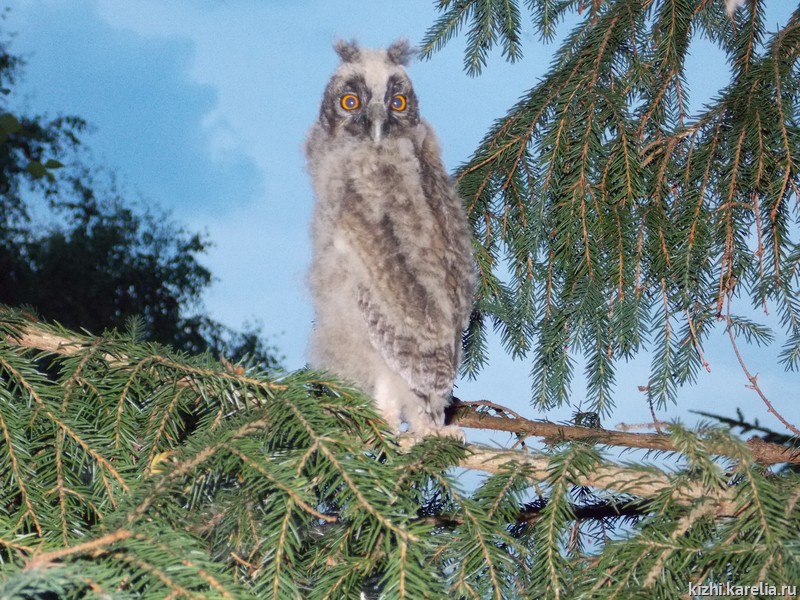 В начале июля довелось мне побывать в деревне Жарниково, что находится на материковой части в километре от острова Кижи. Ничего необычного, на первый взгляд, в этой деревне не было, и все же что-то было не так. Был какой-то странный звук. Он периодически возникал, и его природа была не ясна. Через каждые 4-5 секунд раздавался то ли скрип, то ли писк. Сначала я подумал, что это скрипят пряжки у моего рюкзака. Остановился. Писк продолжился. Потом мне показалось, что где-то скрипят качели… И только проходя мимо огромных старых елей, я заметил, что писк усилился, и стало ясно, откуда он доносился. Боясь спугнуть невидимую причину моего любопытства, я тихонько подкрался поближе и заглянул под густую крону ели. Писк раздавался совсем близко, но глаза, методично обшаривая ветку за веткой, так и не могли обнаружить источник писка. И вдруг все сразу стало ясно: на меня уставились два круглых немигающих глаза. Они смотрели из круглого серого пушистого шара, устроившегося на еловой ветке. Под глазами располагался черный хищный загнутый клюв, который раскрывался время от времени и издавал тот самый писк или скрип. Сверху мохнатого шара торчали два несуразных пучка перьев. Они-то и выдавали видовую принадлежность этого существа.