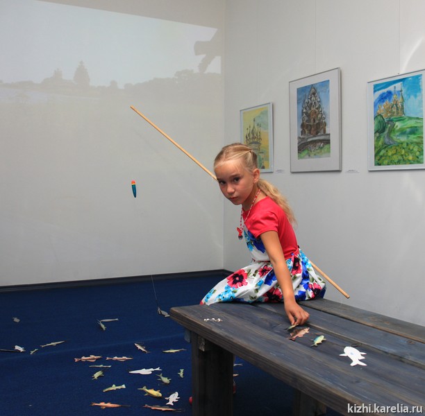 Интерактивные зоны помогали посетителям сразу войти в пространство экспозиции. Например, посидев и отдохнув на пирсе, послушав шум волн, можно было понаблюдать с помощью видеоинсталляции за совершенством творений природы и архитектуры острова, закинув удочку, узнать, какие рыбы существуют в водах Онежского озера. А дальше свои первые впечатления об увиденном выразить в интерактиве «Рисунки на песке».