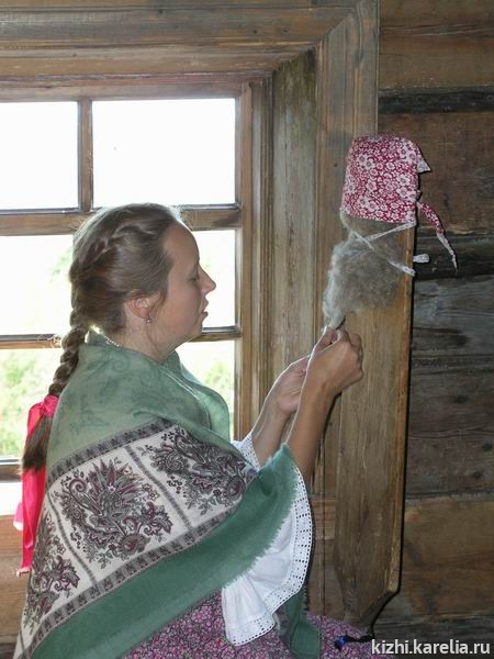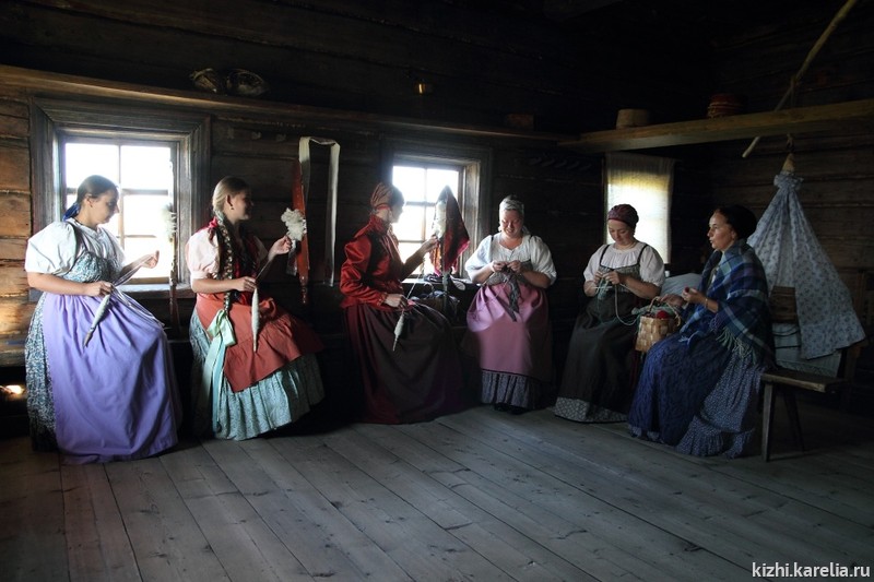 Монотонная работа прядения сопровождалась пением досюльных протяжных песен. Могли исполняться также жестокие романсы — песенный жанр, появившийся в деревне на рубеже XIX—XX веков вследствие влияния городской музыкальной культуры. Иногда к девушкам полюбезничать и потанцевать приходили парни (фото № 5).
