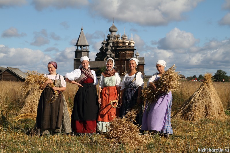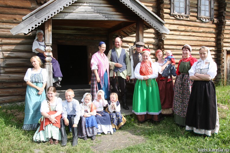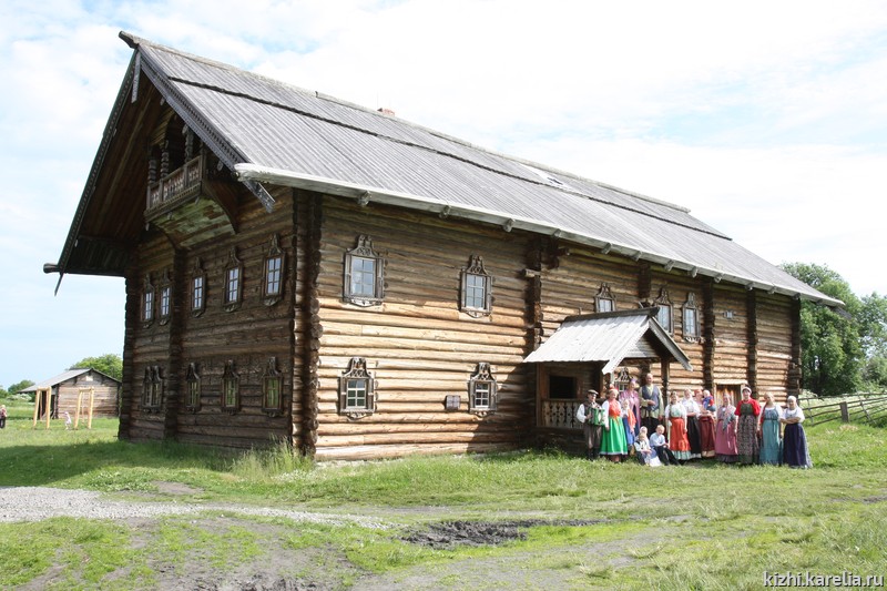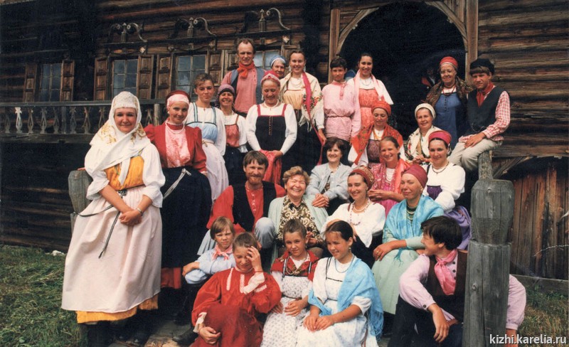Высадившись на берег, участники ансамбля теперь спешат в дом М.Яковлева, где последние несколько лет проходят практически все выступления коллектива, поэтому он стал для них родным и самым красивым. Вот появилась первая группа русских туристов, еще не совсем проснувшихся, поэтому немного вялых, сдержанных в эмоциях. Наша задача не только познакомить их с народной культурой, но и пробудить их сознание, настроить на путешествие по острову, зарядив энергией и положительным настроением. Надо сказать, что в ранние часы людям сложно воспринимать пение, а танцы кажутся инородными в утреннем спокойствии острова, поэтому для первой группы у нас всегда особая программа. В рамках концерта мы показали один из вариантов путешествия по фольклорной карте Карелии, представив певческие традиции разных этнолокальных групп: северокарельскую свадебную руну «Kokko lenti», заонежскую лирическую песню «Во тумане пекёт красно солнышко», поморскую лирическую песню «Цветики, вы лазуревы», исполнявшуюся на качелях, а также пудожскую кадрильную «По бережку, бережку». В этом небольшом фрагменте нам хотелось отразить новое направление в нашей работе — стремление повторить тембровое звучание народной песни, различающееся не только у разных этнолокальных групп, проживающих в Карелии, но и у жителей соседних деревень. Это еще один важный, хотя и весьма сложный шаг на пути к этнографически точному воспроизведению народной песни.