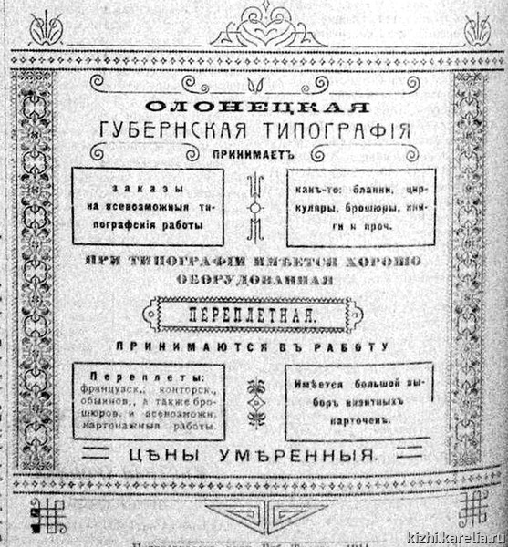 Ну и какая же губернская газета без объявлений — казенных и частных. Так, например, из этого газетного номера можно узнать: «Опытный конторщик нужен на завод торг. дома «А. Беляев и Ко». Обращаться для справки к управляющему завода от 4 ч. дня до 6 ч. вечера». А также следующее: «2 июля в 10 ч. утра в г. Петрозаводске в доме Клавдии Дмитриевны Чепраковой, Зарека, Протасьевская ул., имеют быть торги на постройку школы в д. Хюрсюля...», рекламирует свои услуги и «Олонецкая губернская типография», подчеркивая, что «цены умеренные».