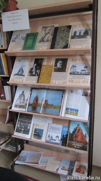 В 3-м томе многотомного издания «Россия. Полное георафическое описание Отечества: Настольная и дорожная книга для русских людей» под редакцией В. П. Семенова (СПб.: Изд. А. Ф. Девриена, 1900), представленном на выставке, сообщается: «Кижский погост находится на острове того же имени, лежащем близ острова Клименецкого. В погосте две церкви, из коих одна Спаса Преображения построена в 1714 году. … Архитектура церкви весьма оригинальна и, несмотря на то, что церковь сооружена уже в царствование Петра Вел., носит вполне самобытный характер, ибо храм сооружался местными самобытными мастерами. Церковь увенчана 25 главами (так указано в тексте), внутренние стены сложены из чрезвычайно толстых и крепких брёвен, размеры которых невольно поражают глаз».