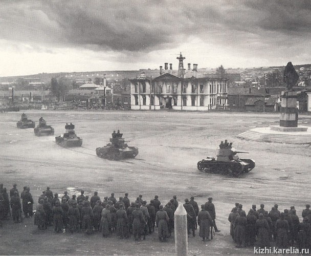 В годы Великой Отечественной войны здание было разрушено, от него остались одни стены со следами копоти от пожара, пустыми проёмами окон. Это хорошо видно на фото, где на пл. Кирова осенью 1941 года проходит парад финских войск, оккупировавших Петрозаводск. Памятник С. М. Кирову накрыт какой-то тканью.