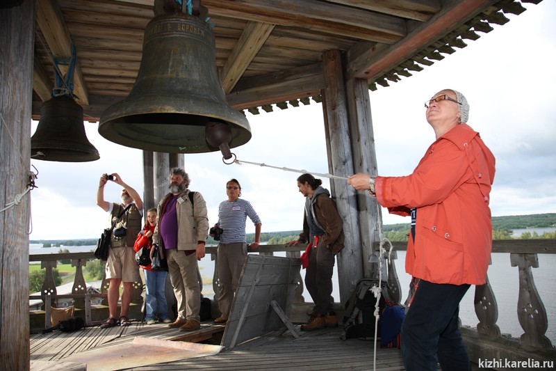 В воскресенье,17 августа, на острове Кижи отмечался День Кижской волости. Как и положено, утром звонари оповестили округу о Воскресной Литургии, которая состоялась в храме Покрова Богородицы. Далеко же слышен звон колоколов звонницы Кижского погоста, плывущий по водной глади Онежского озера! Акустические особенности акватории Кижских шхер были в полной мере использованы при выступлении звонарей на борту поморской лодьи «Святитель Николай», где на реях были развешены колокола учебной звонницы Александро-Невского собора г. Петрозаводска. Лодья доставила к Кижскому погосту гостей фестиваля «Преображения» — ансамбль «Тойве», который в этот день дал целых четыре концерта — в том числе состоялось отдельное представление специально для звонарей-участников проекта. Из-за плотного расписания они не имели до этого возможности стать его зрителями, а теперь никак не желали отпускать артистов на заслуженный отдых, несмотря на то, что сами до этого весь вечер посвятили аудио- и видеозаписи колокольных звонов на самой высокой точке острова Кижи — звоннице часовни Спаса Нерукотворного из деревни Вигово.