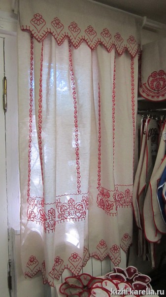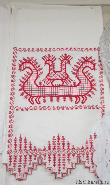 И хотя ручную вышивку давно заменила машинная, народная традиция сохраняется в новых узорах, созданных по мотивам старинных образцов: на белом полотне красные птицы-павы расправляют крылья, скачут кони, распускаются цветы и бегут онежские волны, в белую сетку вплетается затейливый орнамент.