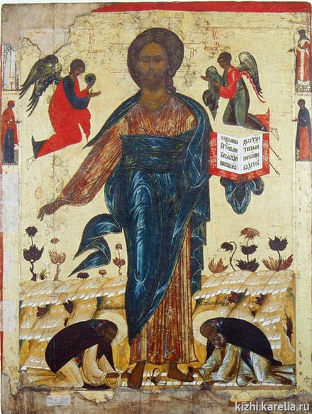 Икона «Спас Вседержитель», упоминаемая в Писцовой книге 1628 года в составе местного ряда церкви-предшественницы храма Кижского погоста Преображения Господня, как основной иконографический тип величественного ростового благословляющего Спасителя, на наш взгляд, была вряд ли уместна.