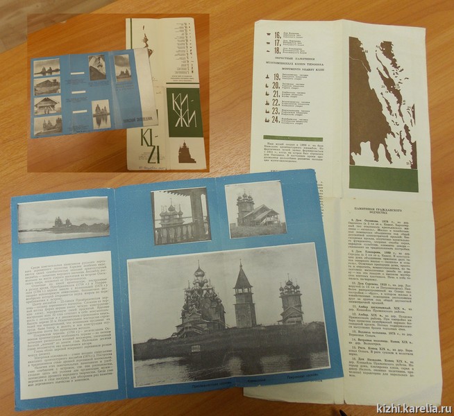 В буклете «Кижи», выпущенном издательством «Карелия» тиражом 25 000 экземпляров, — карта-схема музея-заповедника, на которой обозначены 24 архитектурных памятника, а также даётся кратное их описание по трем разделам: «Кижский архитектурный ансамбль», «Культовые памятники» и «Памятники гражданского зодчества».