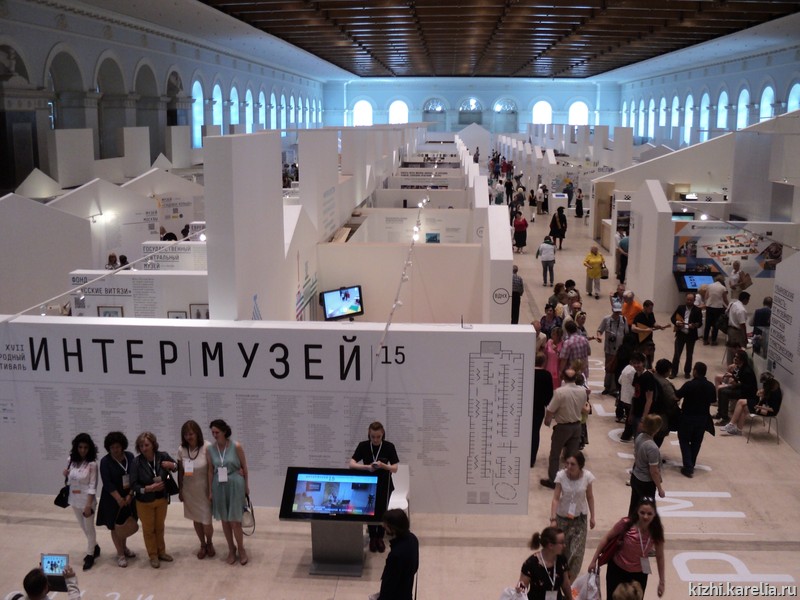 Огромное пространство двух этажей Манежа было разделено на «музейные кварталы», имеющие буквенную напольную маркировку, что безусловно помогало ориентироваться посетителю фестиваля. Информация о музее-заповеднике «Кижи» была размещена в мобильном путеводителе по фестивалю. Все коммуникационные зоны были представлены отдельными площадками: музейный магазин, где была представлена издательская и сувенирная продукция участников фестиваля, музейное кафе, дискуссионные переговорные зоны, несколько интерактивных площадок для детей. Отдельный этаж занимали организации специализирующиеся на околомузейном бизнесе.