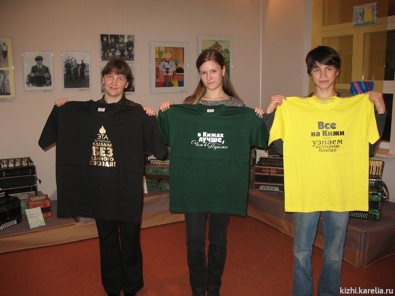 - Юля Фёдорова, ученица 11 класса из п.Эссойла. Юля прислала сразу три слогана – на все сезоны: «Зима? Вставай на лыжи и по Онего - в Кижи!» «Весна и даже осень - в Кижи в гости просим!», но так как жанр требует надписи на летней футболке (чтобы ее видели окружающие), в финал вышел слоган «Лето, отпуск, подскажи!... Отправляйтесь все в Кижи!» (увы, конкурс показал, что дети не знают, как правильно ставить ударение в слове Кижи).