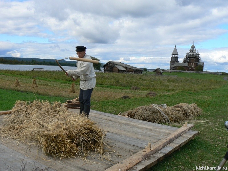 Огромную помощь в проведении жатвы, в ее «озвучивании» заонежскими песнями, всегда оказывал Фольклорный отдел музея. Жали и пели также и многие участники ФЭТа, не числящиеся в штате музея. Это результат большой организационной работы Жанны Гвоздевой, заведующей сектором «Фольклорно-этнографический театр». С самого начала «доброволицы» принимали некоторое участие и в веянии зерна, а с нынешнего года – и в молотьбе зерновых. Обмолот и веяние зерна урожая 2007 года проводились на «далони» - открытом разборном току. Открытый дощатый ток позволяет показать все нам известные приемы молотьбы и веяния, делает возможным участие в красивой работе многих желающих. На очереди – установка в риге из Берёзовой Сельги каменных жерновов для помола муки, муки с наших полей.