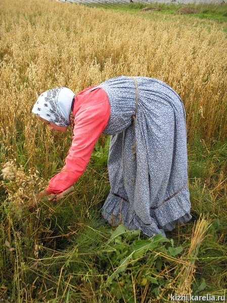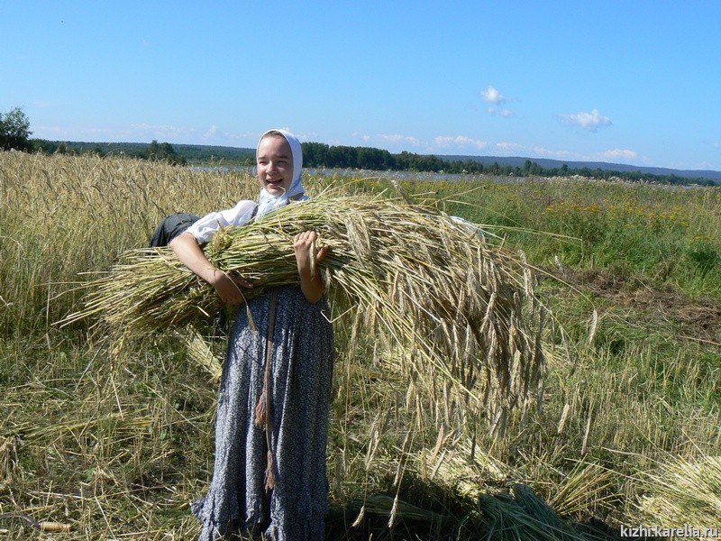 Традиционное земледелие в музее-заповеднике «Кижи»... Что о нем можно рассказать? Сухие цифры таковы: поля в основной экспозиции на острове пашем пятый год, с 9-го июля 2003 года. Жнем хлеб с 2004 года, то есть миновали уже четыре жнитвы. Праздники окончания жатвы, Отжины, отшумели тоже уже четыре раза. Количество сотрудников музея, штатных и внештатных, принимавших участие в жатве, из года в год стабильно и колеблется около числа двадцать. Среди них постоянные работники семи отделов музея и «сезонные» экскурсоводы. Примерно столько же участвуют каждый год и в Отжине. Конечно, в основном это представительницы лучшей половины человечества – «долюшка русская, долюшка женская», как говорится. При этом каждый год на жнитве появляются новые участницы, хотя есть и настоящие «фанатки» жатвы, ждущие конца лета с нетерпением и вновь готовые проводить в работе на поле целые рабочие дни. Хотелось бы сказать слова благодарности Татьяне Баранцовой, Марии Орловой, Евгении Матасовой, Ольге Васьковой, Ксении Наумовой, Наталье Павловой, Марии Мельниковой и всем-всем остальным жнеям и жнецам наших полей, а также тем, кто порывались, имели душевное желание, но не смогли к ним присоединиться.