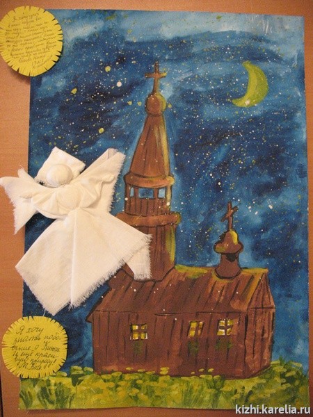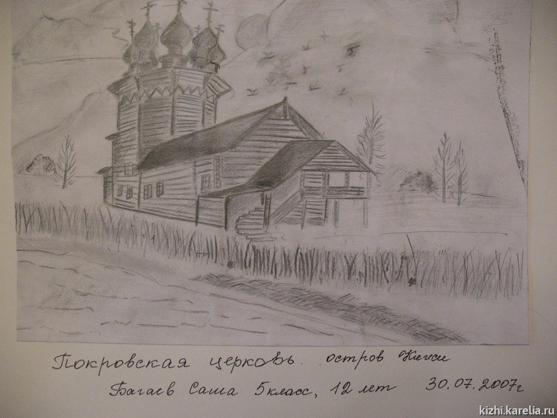 Всё поспеть хотели к заутрене Да на славный дивный остров Кижи А к тому ли острову Кижскому Так пешком никто не прохаживат, На добром коне не проезживат. Лишь на крыльях «кометы» той быстрокрылой Добрались мы до острова чудного. Выходили к нам красавицы Кижские В сарафанах да подпоясанные, Отворяли-то дверь в дом Ананьина, Дом старинный да просторный. И сажали нас да за пир честной, Угощали пряниками клюквенными, Вкусно потчевали, приговаривая: «Чудеса вас ждут необычные, Красота этих мест невиданная, И узнаете вы о сказителях Тех, что жили здесь много лет назад».