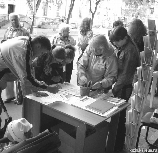 Как и полагается в праздник, были в этот день и призы, которые разыгрывались среди тех, кто любит Кижи и хорошо знает историю заповедного острова. Желающих получить газету «Кижи» в подарок было множество. Им была предложена анкета с вопросами об острове, за заполненную анкету – Дайджест газеты «Кижи» в подарок.