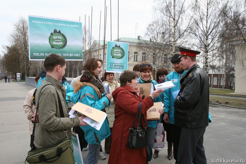 24 апреля в честь Дня Земли группа сотрудников музея начала акцию с шествия по улице Куйбышева. Участники несли плакаты: «После нас чище, чем до нас!», «Мы в ответе за жизнь на планете», раздавали прохожим информационные листки и семена ржи, выращенной на острове Кижи. Горожане удивлялись, недоумевали и радовались, получив такой подарок. Очень важно, что информация об экологической деятельности музея была вручена прямо в руки горожанам с добрыми словами и пожеланиями здоровья и благоденствия. Тем самым музей «Кижи» обозначил свою позицию, желание не призывать, а активно действовать для решения назревших проблем. Шествие закончилось в районе исторической застройки у здания Лекционно-выставочного комплекса музея «Кижи», где и состоялось торжественное открытие мероприятия с участием Фольклорно-этнографического театра.