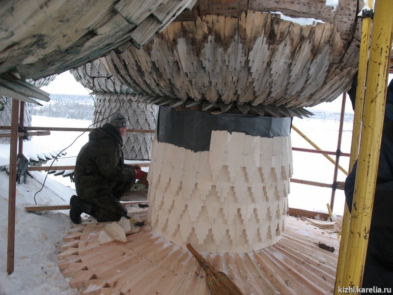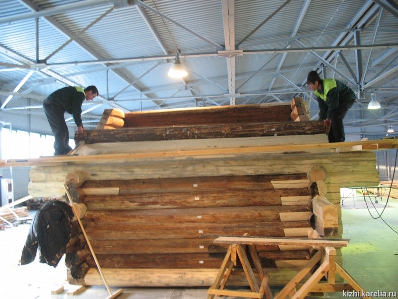 Плотник-реставратор Федор Штурмин добавляет: «После тщательного исследования деталей памятника каждый реставрируемый элемент был «вымыт» мойкой высокого давления. Затем сгнившая часть бревна удалялась, бревно шлифовалось и вместо удаленной части изготовлялись такие же новые части бревна —коронка, вычинка или протез, которые приклеивались при помощи специального клея. После склеивания детали подгонялись по форме исходного элемента, затем скреплялись березовыми нагилями или саморезами и ставились на определенное время на опрессовку под специальные сжимы, которые были сконструированы и изготовлены сотрудниками Плотницкого центра. Бревно в таком состоянии находится порядка двенадцати часов».