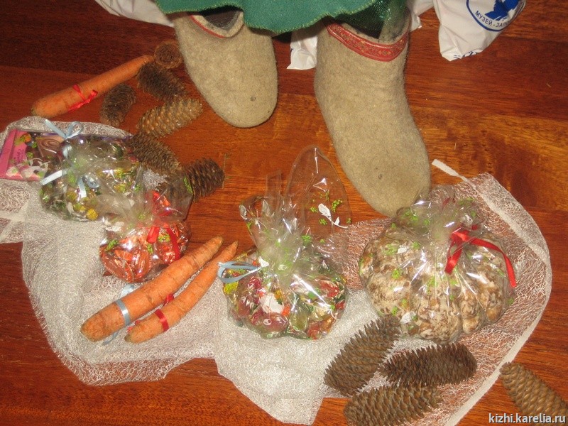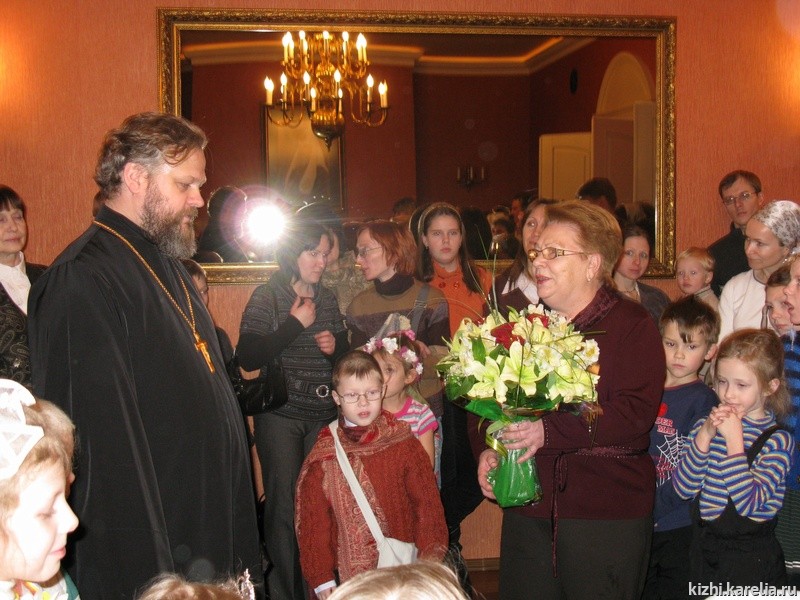 Поэтому прихожане и сотрудники музея "Кижи" радостно отзываются на приглашение посетить Рождественскую ёлку. Ёлка начинается со службы. Служба в этот день короткая, чтобы даже самые маленькие ребятишки смогли посетить церковь. В 2009 году впервые Настоятель Спасо-Кижского Патриаршего Подворья, протоиерей Николай Озолин, пригласил продолжить празднование Рождества в здании Спасо-Кижского Патриаршего Подворья. В каминном зале детей ждала пушистая ёлка. Вокруг ёлки – новогодние подарки, собранные Дедом Морозом из Патриаршего Подворья и музейной снегурочкой. Рождественский тропарь поведал о Рождении Христа. Дети прихожан подготовили сюрприз – Рождественское представление. Со своей сказкой пришли и участники детской фольклорной группы музея «Кижи», руководимой Натальей Михайловой. Ну и какая же ёлка без Деда Мороза и без хоровода! На празднике побывало около ста детей, а с каждым ребенком – один или два взрослых.