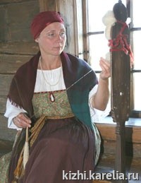 Дом — в экспозиции острова-музея Кижи. Певучее крыльцо. Молодая пряха в традиционном русском наряде старательно проживает жизнь деревенской девушки конца XIX века… Чу! В открытые ставни истории хлынул мутный солнечный свет. В блеклом старинном зеркале встретились глазами моя современница и девушка-крестьянка. Истаял светец. Остыла печка. Привычно вытягивают пальцы льняную нить. Стучит веретено. Много пряжи в доме. Зябко в нетопленной горнице. Впереди долгая карельская зима. Падает прогоревшая лучина, катятся слезы в кадку со студеной водой… В два оконца – в красном углу дома – озеро колышется, плывут по своим делам лодки, тянется солнечная пыль короткого карельского лета. Нынче в Кижах праздник! Отставила веретено девушка. На зеленой поляне возле двух величественных деревянных храмов подруги хоровод затевают. В цветастом сарафане, в платке с красными, синими, белыми цветами идет по улице русская красавица! Радостно бьется сердце при звуке колокола – языка веры Христовой, языка судьбы, былинной земли заонежской. Праздник в Кижах!.. Недолги посиделки. Не полощутся белые ночи в водах Онего. Пали июльские сумерки. Мамка зовет домой. Много льняной и шерстяной пряжи заготовлено в доме… Катятся звезды, капают слезы, падает уголек лучины в широкое озеро души.