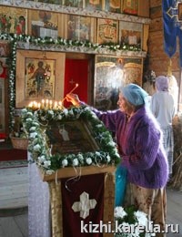 С началом праздничного молебна Кижский погост осветило яркое солнце. К хору кижских певчих присоединился скромно стоящий в стороне московский гость Олег Диденко, солист «Новой оперы». Его густой бас разливался под сводами Покровской церкви, придавая праздничной службе еще большую красоту и торжественность.