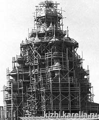В 100-летнем возрасте Преображенская церковь Кижского погоста изменила свой первоначальный образ кардинальным образом: бревенчатые срубы были обшиты тесом, а многочисленные главы обиты листовым железом. Наружная обшивка была отдана по Договору в 1818 году подрядчику Егору Потапову «с товарищи», а обивка глав железом – подрядчику Егору Михееву. Листовое железо и гвозди закупали в Петрозаводске у купца Андрона Гаврилова, а также в Санкт-Петербурге.